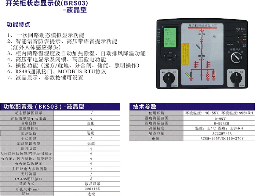 BRS03開關柜智能操顯裝置是根據當前高壓系統(tǒng)開關柜技術發(fā)展而設計開發(fā)的一種新型的模塊化、智能型的操作測量顯示控制裝置。產品集中指示一次回路模擬狀態(tài)、手車位置、隔離刀位置、接地刀位置、開關狀態(tài)、操作機構儲能狀態(tài);帶有高壓帶電指示、帶電閉鎖輸出、自動加熱除濕、實時數(shù)字顯示溫濕度值及加熱器故障監(jiān)測、超高溫報警并強制停止加熱、智能語音防誤提示、RS485通信接口等多種功能,簡化了開關柜面板設計,美化了部局,完善了開關狀態(tài)指示功能和安全性能。目前該系列產品已廣泛地應用于電力、化工、鐵路、礦山、冶金、水泥等諸多行業(yè)。
