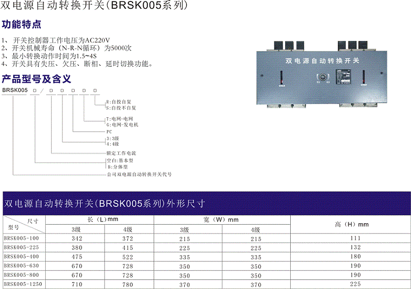 BRSK005系列雙電源自動轉換開關是用于交流50HZ,額定電壓400V及以下的兩路電源系統(tǒng),可以完成常用電源和備用電源的自動轉換而無需人工進行操作。
