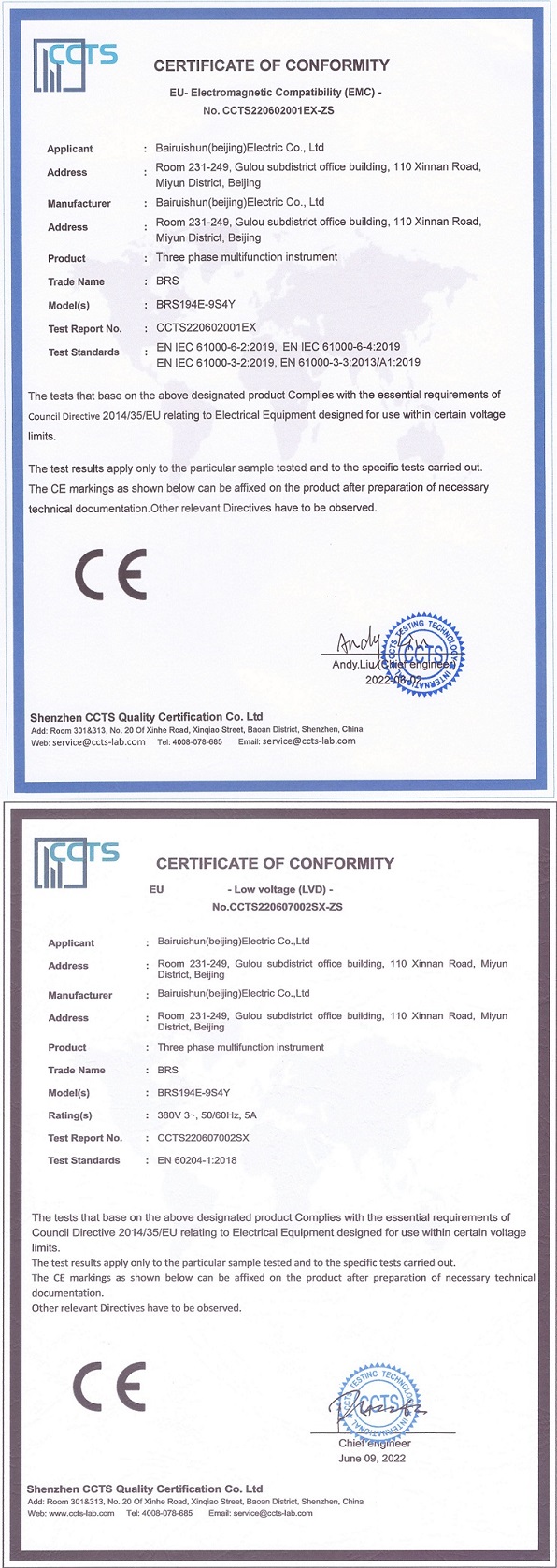 經(jīng)過(guò)前期嚴(yán)格的產(chǎn)品檢測(cè)和綜合評(píng)定后,百瑞順多功能儀表BRS194E-9S4Y和電動(dòng)機(jī)保護(hù)器BRS2310G順利通過(guò)歐盟產(chǎn)品安全CE認(rèn)證,這不僅意味著百瑞順產(chǎn)品擁有了在30個(gè)歐洲國(guó)家內(nèi)自由流通的“通行證”,更加證明百瑞順產(chǎn)品是具有國(guó)際高水準(zhǔn)品質(zhì)的產(chǎn)品。