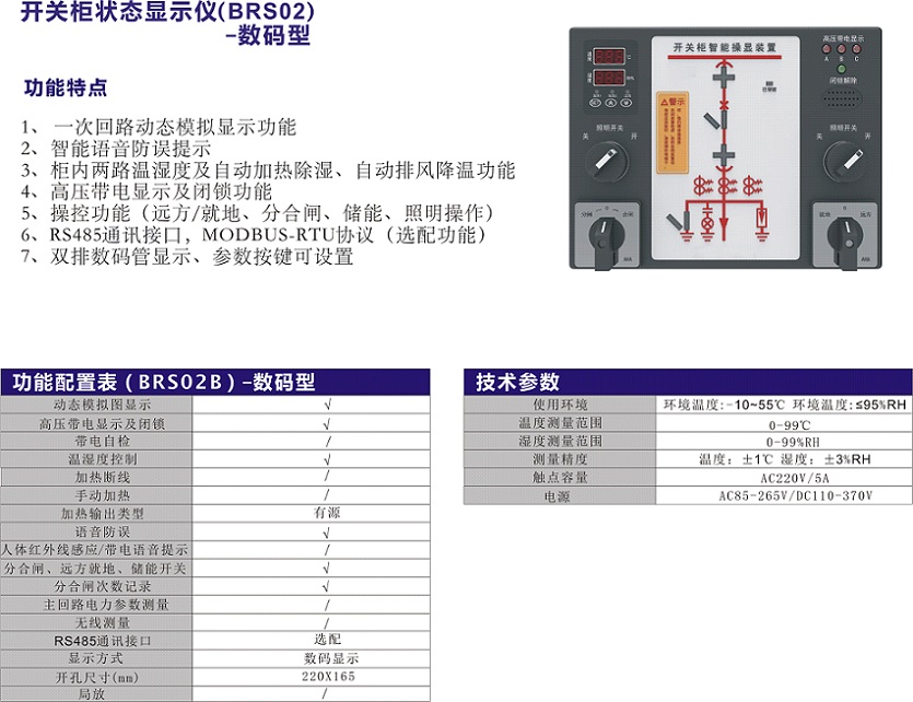 BRS02B開關(guān)柜智能操顯裝置是根據(jù)當(dāng)前高壓系統(tǒng)開關(guān)柜技術(shù)發(fā)展而設(shè)計(jì)開發(fā)的一種新型的模塊化、智能型的操作測(cè)量顯示控制裝置。產(chǎn)品集中指示一次回路模擬狀態(tài)、手車位置、隔離刀位置、接地刀位置、開關(guān)狀態(tài)、操作機(jī)構(gòu)儲(chǔ)能狀態(tài);帶有高壓帶電指示、帶電閉鎖輸出、自動(dòng)加熱除濕、實(shí)時(shí)數(shù)字顯示溫濕度值及加熱器故障監(jiān)測(cè)、超高溫報(bào)警并強(qiáng)制停止加熱、智能語(yǔ)音防誤提示、RS485通信接口等多種功能,簡(jiǎn)化了開關(guān)柜面板設(shè)計(jì),美化了部局,完善了開關(guān)狀態(tài)指示功能和安全性能。目前該系列產(chǎn)品已廣泛地應(yīng)用于電力、化工、鐵路、礦山、冶金、水泥等諸多行業(yè)。