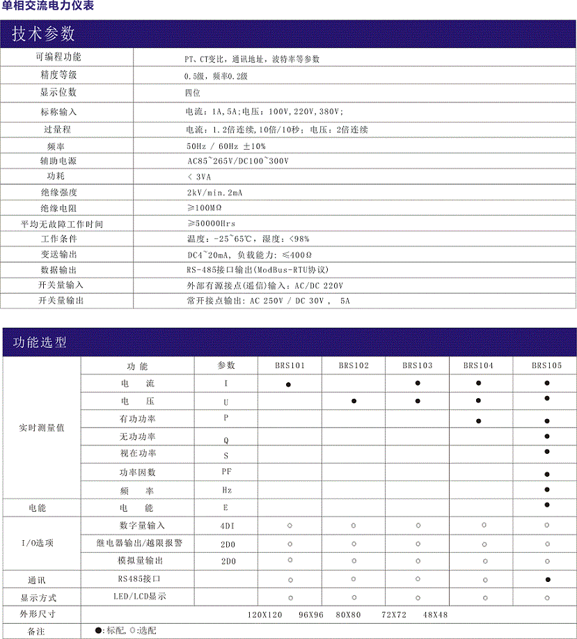 BRS100系列單相交流電力儀表具有交流電力參數(shù)測量、RS485串行輸出、模擬量輸出、接點輸出等功能。能實時顯示被測電量值、電能,可手動或上位機設定地址、波特率、變比、模擬量輸出、繼電器輸出,具有性價比高、穩(wěn)定性好等特點,是一款經濟、實用的單相交流電力參數(shù)測量儀表。