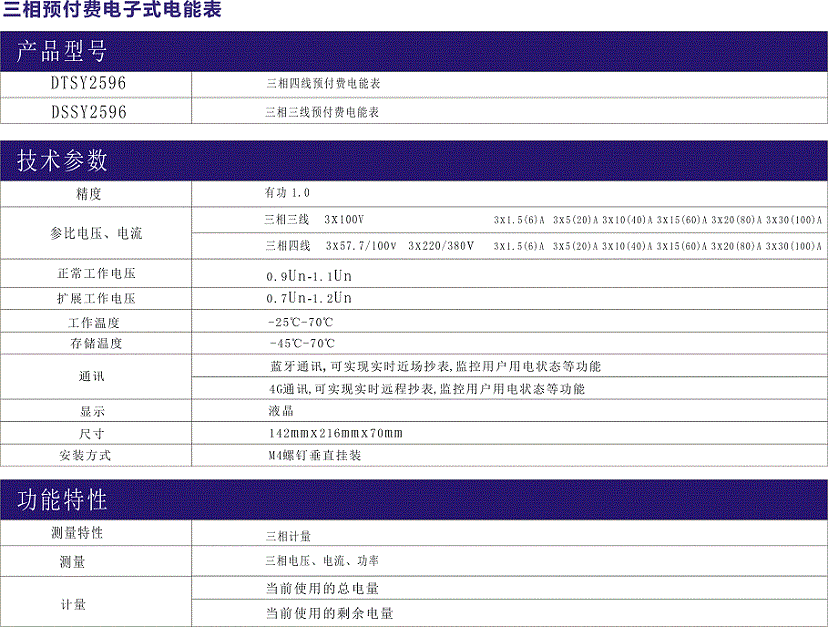 DT(S)SY2596型三相電子式藍牙智能+4G遠程預(yù)付費電能表是一種軟件、硬件、結(jié)構(gòu)設(shè)計技術(shù)先進,計量精度高,可進行正向交流有功電能計量的新型產(chǎn)品,具有高可靠性、高過載、低功耗等特點。